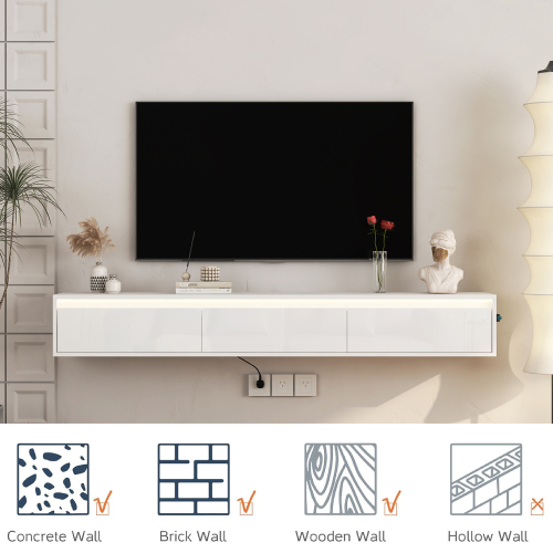 This floating TV shelf simplifies installation and cable management while elevating room aesthetics. The durable MDF construction and glossy finish are easy to clean, and the LED lighting adds mood and visibility for media nights. Integrated power access reduces extension cord needs and keeps equipment tidy.