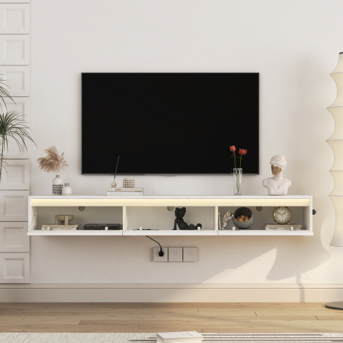 Elevate your living room with the Floating TV Stand Wall Mounted LED Lights Power Outlet—a sleek, wall-mounted media shelf that keeps your setup tidy and stylish. Perfect for modern homes seeking a clean, contemporary look with practical features designed for a seamless media experience.